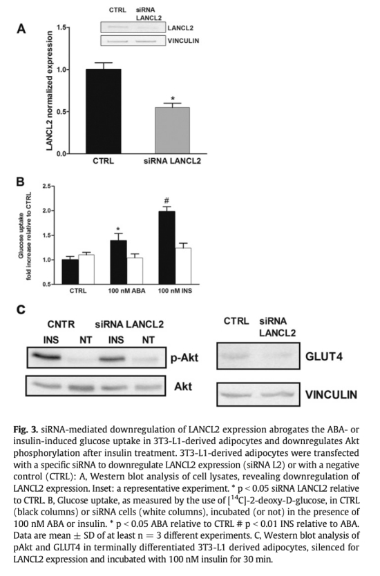 1 葡萄糖攝取和GLUT4表達:ABA處理增加3T3-L1脂肪細胞GLUT4蛋白表達和葡萄糖攝取,類似胰島素效應,但依賴PI3K通路。LANCL2沉默消除ABA和胰島素的刺激作用,而過表達增強基礎葡萄糖攝取。數據來自圖1和圖3。研究意義:表明ABA通過LANCL2受體激活胰島素樣信號通路,增強脂肪細胞葡萄糖處置,為ABA改善糖代謝提供機制證據。
