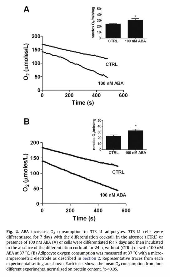 5 代謝產物測量:ABA減少脂肪細胞甘油三酯積累,但增加CO2產生,表明葡萄糖氧化增強而非脂質儲存。數據來自圖5。研究意義:反映ABA促進能量消耗型代謝,與棕色化表型相符,可能減少脂質蓄積。