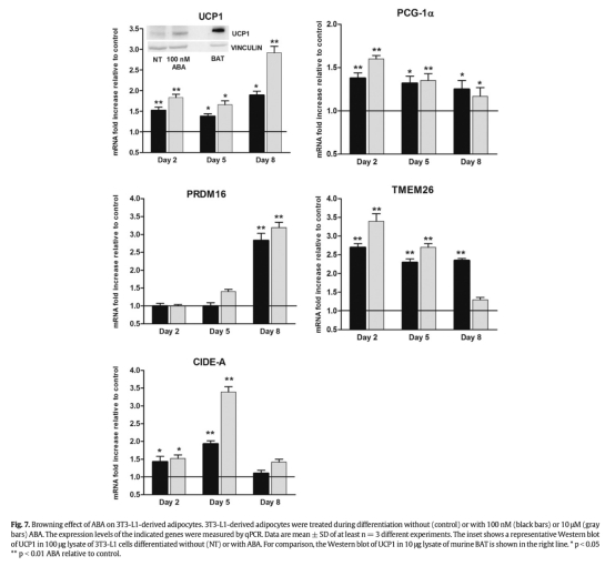 3 基因表達分析:ABA上調棕色脂肪標記基因(UCP1、PGC-1α、PRDM16、CIDE-A等)在脂肪細胞中的表達,并增加線粒體DNA含量。數據來自圖6、圖7和圖9。研究意義:證實ABA誘導白色脂肪棕色化,促進產熱相關基因編程,可能有助于對抗肥胖和胰島素抵抗。