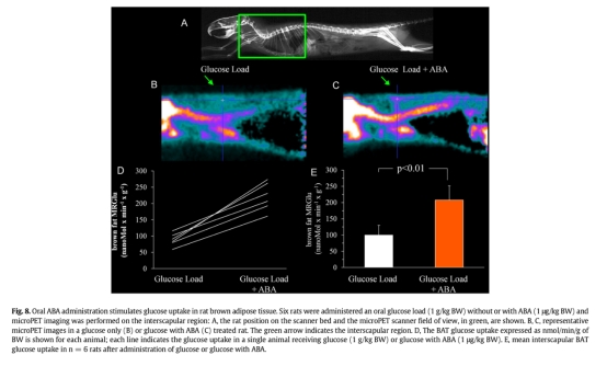 4 體內葡萄糖攝取和組織變化:口服ABA(1μg/kg)增加大鼠棕色脂肪葡萄糖攝取(微PET顯示2倍升高),長期處理上調小鼠白色脂肪棕色基因和線粒體含量。數據來自圖8和圖9。研究意義:顯示ABA在整體動物水平激活棕色脂肪代謝,改善葡萄糖處置,提示其治療代謝疾病的潛力。