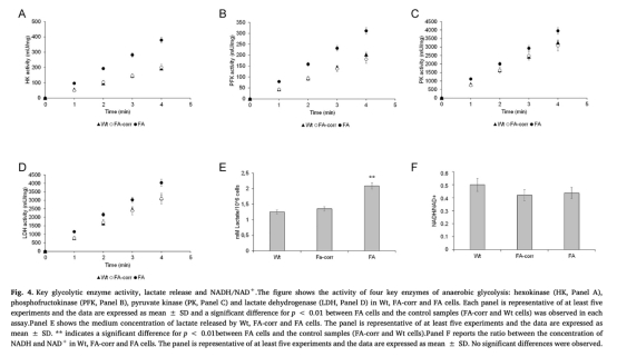 3 糖酵解酶活性和乳酸釋放:HK、PFK、PK和LDH活性在FA細胞中增加,乳酸釋放升高。數據來自Fig.4。研究意義:證實FA細胞依賴糖酵解作為主要能量來源,糖酵解通量增加有助于維持NAD+/NADH平衡,但能量效率低,可能與細胞未成熟狀態相關。