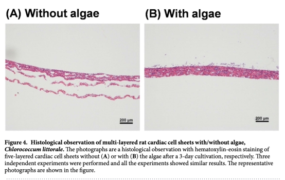 這篇論文報道了一種創新的體外共培養系統,將哺乳動物細胞(C2C12小鼠成肌細胞和大鼠心肌細胞)與藻類(Chlorococcum littorale)結合,創建三維組織。在共培養系統中,藻類能主動產生氧氣,而哺乳動物細胞消耗氧氣。這種共生關系使多層心肌細胞組織的代謝從無氧呼吸部分轉變為有氧呼吸,顯著降低了葡萄糖消耗、乳酸產生和培養基中氨含量。組織學觀察顯示,與藻類共培養的心肌組織狀態良好,厚度達到160微米,而單獨培養的組織出現分層和損傷。該研究提出了哺乳動物細胞與藻類共生的體外"回收系統"概念。