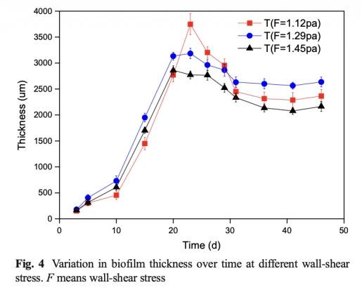 1 生物膜厚度:數據來自圖4,顯示生物膜厚度隨壁面剪切應力變化,在1.29 Pa時最大(2.7±0.1 mm)。研究意義在于生物膜厚度影響傳質過程,進而調控微生物活性和降解效率。