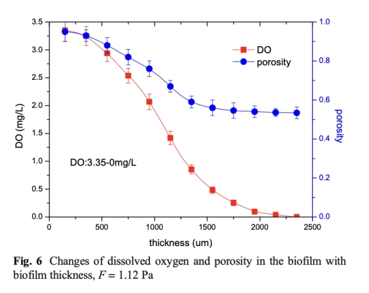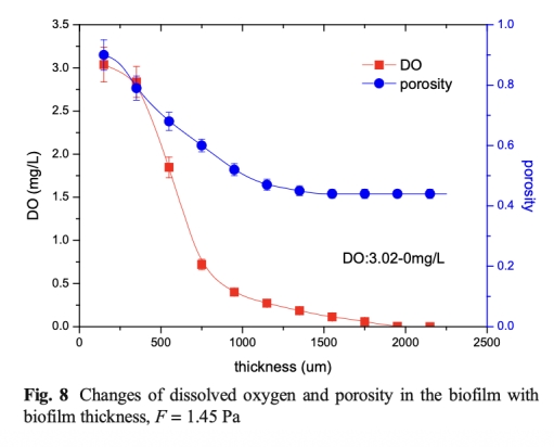 2 孔隙率:數據來自圖5、6、7、8,顯示孔隙率隨壁面剪切應力增加而降低(從69.1%到55.1%)。研究意義是孔隙率決定氧氣和底物在生物膜內的傳遞能力,影響微生物的分布和代謝活動。