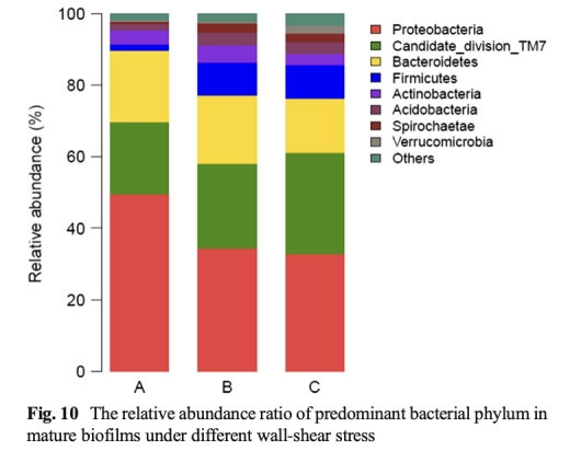 4 微生物群落結構:數據來自表2和圖10,通過高通量測序顯示主要菌門為Proteobacteria、Candidate_division_TM7和Bacteroidetes,其比例隨剪切應力變化。研究意義是微生物多樣性差異反映了環境適應性,與氧氣條件和孔隙率相關,影響降解能力。