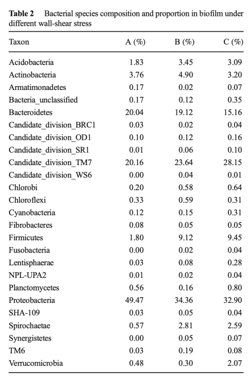 1 壁面剪切應力顯著影響生物膜的物理和微生物結構,孔隙率隨剪切應力增加而降低,微生物群落中Proteobacteria和Bacteroidetes比例減少,而Candidate_division_TM7增加。