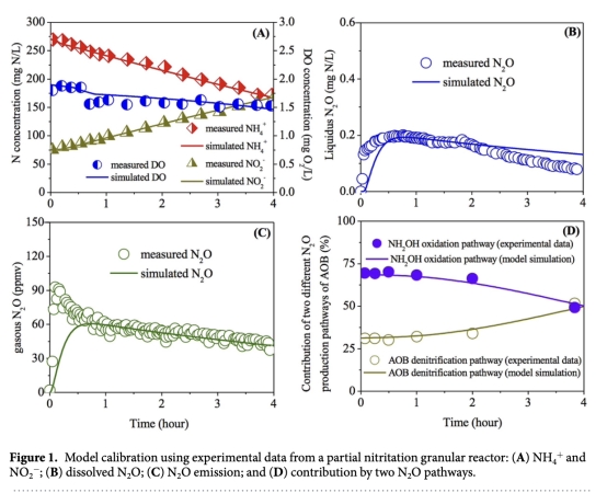 1 氮化合物濃度(NH4+、NO2-)和溶解氧動態:數據來自圖1A。研究意義是驗證模型對反應器基本性能的預測能力,確保模型能準確描述硝化過程,為N2O產生機制分析提供基礎。