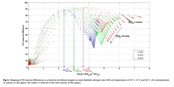 2. 總氮去除效率受溫度影響顯著,低溫會嚴重限制AOB的好氧活性。存在一個最優的供氧量(RO)可以使總氮去除效率最大化,超過此值效率會因NOB活性增強(需要更多碳源)和異養反硝化受抑制而下降。