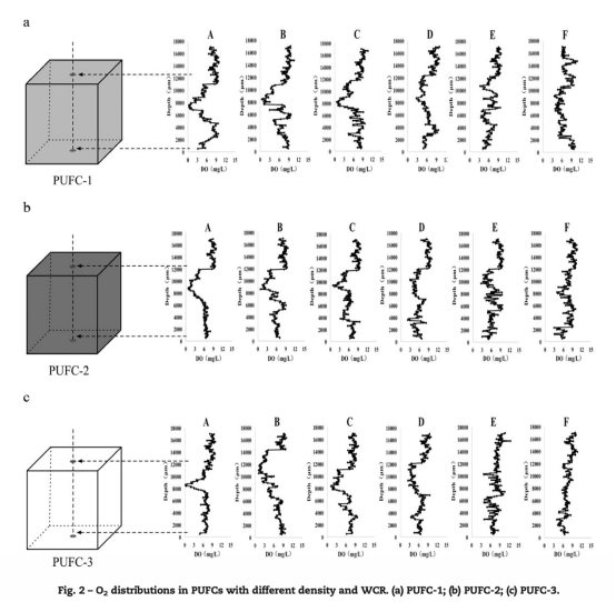 研究首先使用微電極測量不同密度和水分含量率的PUFCs中的O2分布,并通過三維模擬分析O2和H2O的空間分布。同時,利用掃描電子顯微鏡觀察PUFCs結構,并通過PCR-DGGE分析微生物種群。研究比較了有微生物附著的PUFCs和未使用的PUFCs,以探討O2和水分對微生物分布的影響機制。
