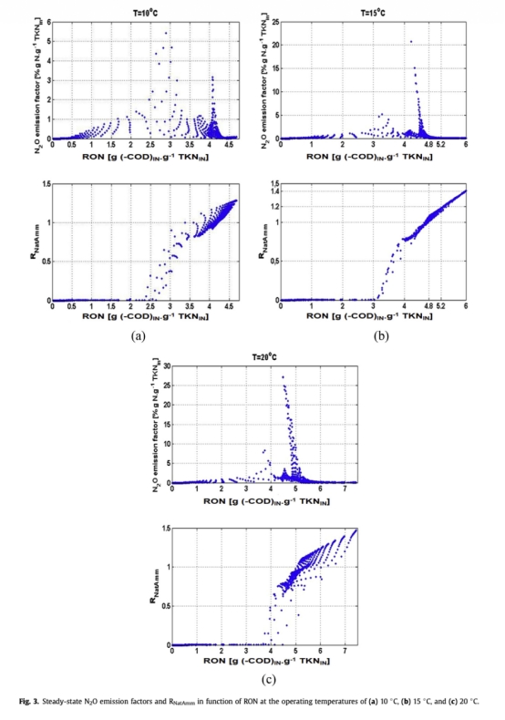 1 N2O排放因子數據:來自Fig. 1a和Table 5。數據顯示N2O排放因子隨氧負荷比(RON)的變化,在特定RON值下達到最小。研究意義在于確定了最小化N2O排放的最佳操作點,并為控制器設定點的確定提供了依據,表明通過調節氧氣供應可以有效控制N2O生產。