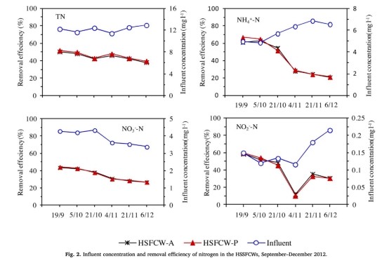 1 氮濃度數據:來自Fig.2,顯示進水和出水的TN、NH4+-N、NO3--N濃度變化及去除效率。研究意義在于量化濕地的脫氮性能,證實間歇操作下平均TN去除效率為45.2%,并揭示NH4+-N和NO3--N去除與水溫正相關,為優化濕地運行參數提供依據。