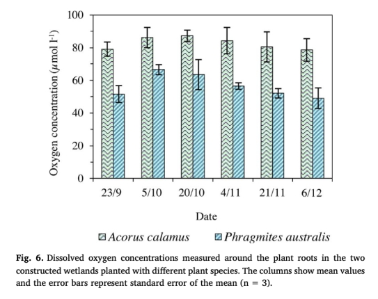 4 根際溶解氧濃度數據:來自Fig.6,顯示菖蒲和蘆葦根際的溶解氧濃度。研究意義在于菖蒲根際氧濃度顯著高于蘆葦,證實植物種類影響根際氧釋放,從而調控硝化細菌活性,但因廢水氮負荷低,未導致脫氮效率差異,強調濕地設計需考慮植物選擇和進水負荷。