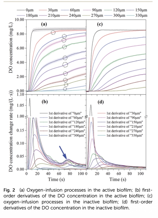1 氧濃度隨時間變化的動態數據:測量了生物膜不同深度處的溶解氧濃度隨時間的變化,來自Fig. 2和Fig. 3。研究意義是首次揭示災變點現象,表明微生物活動導致DO變化率突變,為識別氧限制轉化為生物量限制的關鍵點提供依據。