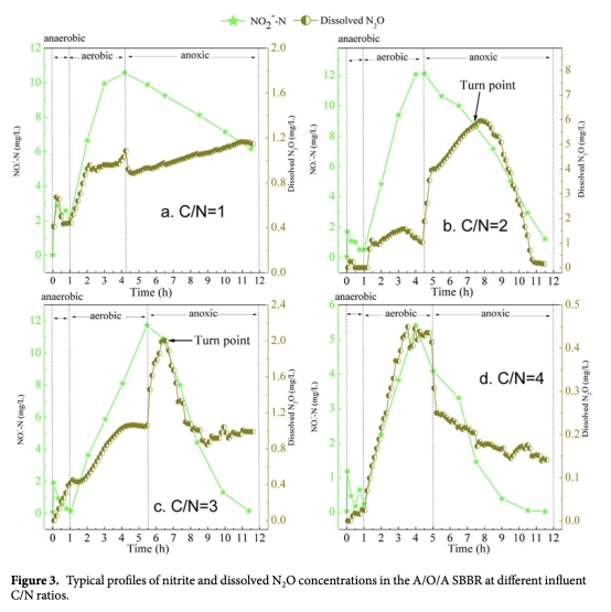 4 亞硝酸鹽和溶解N2O濃度曲線數據,來自Figure 3。研究意義是顯示C/N比影響亞硝酸鹽積累和N2O還原抑制點,如C/N=3時抑制閾值升高(10.92mg/L NO2--N),表明高C/N比緩解抑制,降低N2O積累。