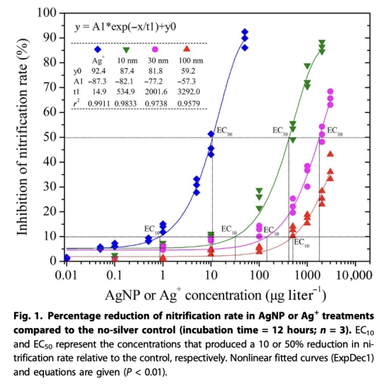 1 硝化抑制率數據:測量了不同濃度AgNPs和Ag+暴露12小時后的硝化抑制率,來自Figure 1。研究意義是首次量化了AgNPs對硝化作用的尺寸依賴性毒性(10 nm AgNPs的EC50為421 μg liter-1,毒性最強),證實毒性與釋放的Ag+濃度顯著相關,為評估AgNPs的環境風險提供了閾值參考。