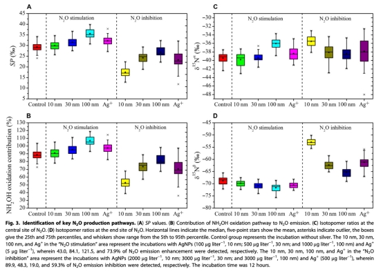 3 N2O同位素值數據:分析了N2O的氮位點偏好(SP值),來自Figure 3。研究意義是通過SP值變化(低劑量暴露下SP值升高至35.6‰)確定羥胺氧化是AgNPs刺激N2O產生的主要途徑(貢獻>90%),明確了AgNPs干擾氮循環的關鍵環節。