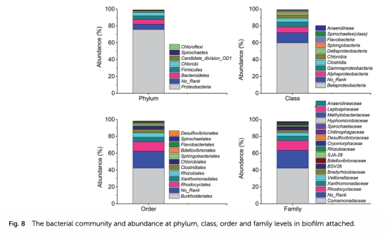 4 微生物群落組成數據:通過高通量測序分析生物膜中菌門、綱、屬水平分布,來自圖8和表2。研究意義是發現變形菌門為主(75.6%),反硝化菌如Simplicispira豐度高(16%),闡明微生物驅動反硝化過程,為群落調控提供基礎。