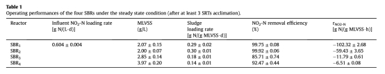 1 NO2-N去除效率和反硝化速率數據:測量了不同碳源下NO2-N去除效率(99.75%、99.92%、85.71%、92.47%)和反硝化速率(102.32、59.43、11.79、6.51 mg N/(g MLVSS·h)),來自表1。研究意義是證實簡單有機碳促進高效反硝化,而復雜碳源導致速率降低,為碳源選擇提供依據,以優化脫氮效率。