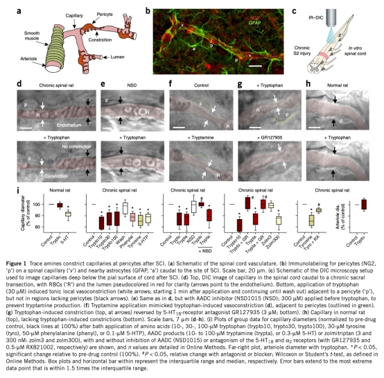 論文摘要指出,中樞神經系統血管受神經元活動控制,脊髓損傷后,損傷部位以下的脊髓因單胺神經支配丟失,導致血管張力適應異常。研究發現,慢性脊髓損傷后,脊髓處于慢性缺氧狀態,原因是周細胞上單胺受體(如5-HT1B)在缺乏單胺的情況下被痕量胺(如色胺)過度激活,導致毛細血管收縮,血流減少至缺血水平。痕量胺由周細胞異位表達的芳香族L-氨基酸脫羧酶(AADC)從飲食氨基酸(如色氨酸)合成。抑制單胺受體或AADC,或增加吸氧,可緩解缺氧并改善運動神經元和運動功能。
