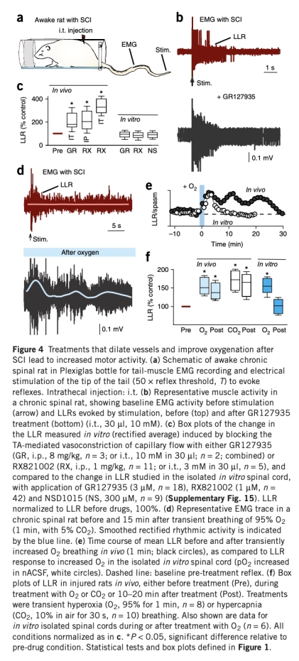 4 運動功能數據來自Fig.4,通過EMG記錄自發活動和感覺誘發反射,顯示受體拮抗劑或高氧吸入增加EMG活動和運動爆發,研究意義是表明改善血流和氧氣供應可增強運動輸出。