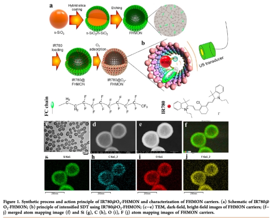 論文摘要指出,缺氧作為實(shí)體瘤的標(biāo)志性特征,會(huì)導(dǎo)致癌癥轉(zhuǎn)移和進(jìn)展,并誘導(dǎo)對(duì)氧依賴(lài)性療法(如放療、化療和光動(dòng)力療法)的抵抗。為了解決這些問(wèn)題,研究建立了一種自產(chǎn)氧的聲動(dòng)力治療(SDT)納米平臺(tái),采用改性氟碳(FC)鏈介導(dǎo)的氧傳遞協(xié)議,實(shí)現(xiàn)對(duì)缺氧胰腺癌的高效SDT。該納米平臺(tái)利用功能化中空介孔有機(jī)硅納米顆粒(FHMONs)作為載體,其介孔和FC鏈分別提供聲敏劑(IR780)和氧氣的存儲(chǔ)容量和結(jié)合位點(diǎn)。體外和體內(nèi)實(shí)驗(yàn)表明,該納米平臺(tái)能突破缺氧特異性運(yùn)輸屏障,在超聲波照射下向缺氧PANC-1細(xì)胞提供充足氧氣,緩解缺氧,從而抑制缺氧誘導(dǎo)的SDT抵抗,產(chǎn)生足夠活性氧(ROS)殺死PANC-1細(xì)胞并縮小腫瘤。這種獨(dú)特的FC鏈介導(dǎo)氧傳遞方法為缺氧氧合提供了途徑,并具有緩解缺氧誘導(dǎo)抵抗的潛力。