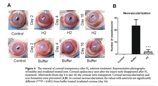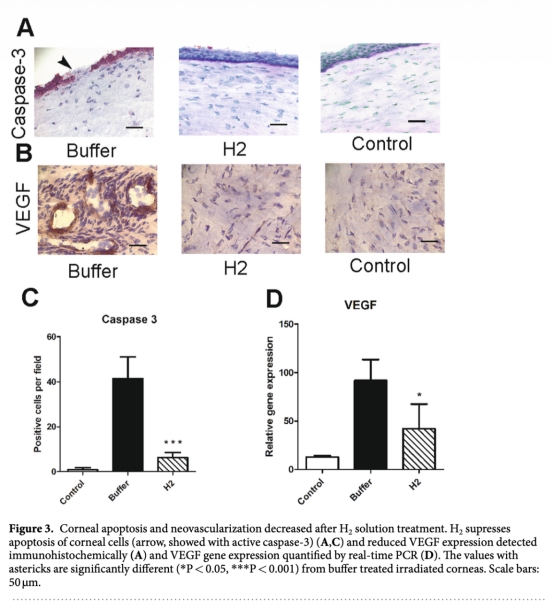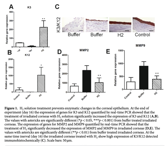 本研究旨在檢驗分子氫是否能夠減輕UVB輻射誘導(dǎo)的角膜損傷后的氧化應(yīng)激。研究發(fā)現(xiàn),UVB輻射會導(dǎo)致角膜上皮中抗氧化酶和促氧化酶之間的失衡,以及金屬蛋白酶與其生理抑制劑之間的失衡,從而導(dǎo)致氧化應(yīng)激和角膜內(nèi)炎癥的發(fā)展。在UVB照射和愈合期間,使用溶解于PBS中濃度為0.5 ppm wt/vol的H2處理兔角膜。未經(jīng)處理或僅用緩沖液處理的照射角膜出現(xiàn)了氧化應(yīng)激、過度炎癥、丙二醛和硝基酪氨酸表達,愈合并伴有瘢痕形成和新生血管。相比之下,經(jīng)H2處理的照射角膜,氧化應(yīng)激被抑制,丙二醛和硝基酪氨酸表達缺失,角膜愈合并恢復(fù)了透明度。該研究首次提供了H2在預(yù)防UVB照射角膜氧化和亞硝化應(yīng)激中作用的證據(jù)。