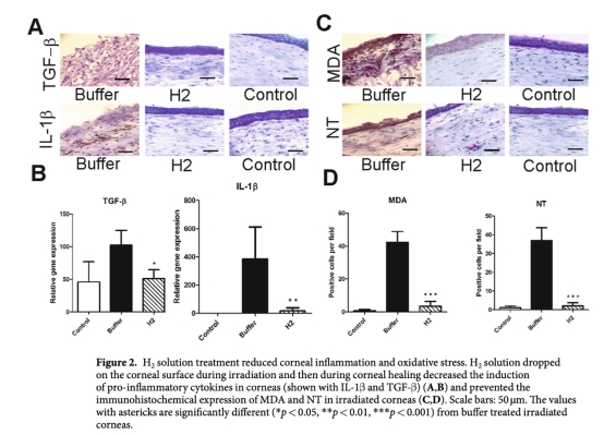 3. 炎癥與氧化應(yīng)激標志物數(shù)據(jù):檢測了炎癥因子IL-1β, TGF-β以及氧化應(yīng)激標志物MDA, NT的表達。這些數(shù)據(jù)通過免疫組化和實時定量PCR獲得,展示在Figure 2中。研究意義:這些數(shù)據(jù)表明H2具有抗炎和抗氧化作用,能有效抑制UVB誘導(dǎo)的角膜炎癥反應(yīng)和氧化/硝化損傷。