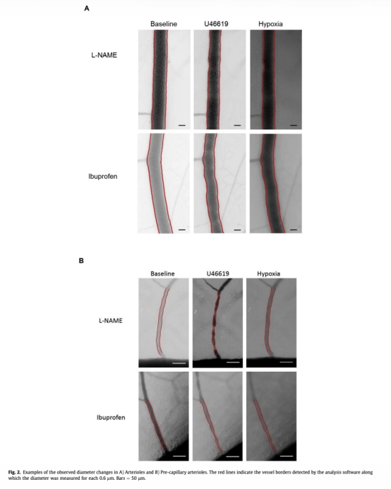 2. 缺氧誘導的血管擴張數(shù)據(jù):測量了在正常條件、加入L-NAME或布洛芬后,缺氧刺激引起的血管直徑變化百分比。關鍵發(fā)現(xiàn)是,在L-NAME存在下,小動脈和毛細血管的擴張顯著小于前毛細血管小動脈(p < 0.04);而在布洛芬存在下,毛細血管和前毛細血管小動脈的擴張顯著小于小動脈(p < 0.04),如圖3B所示。研究意義:直接證明了NO和COX產(chǎn)物在不同管徑血管的缺氧性血管擴張中扮演不同權重的角色。小動脈的擴張更易受COX抑制影響,而前毛細血管小動脈的擴張對NO抑制更敏感,這揭示了視網(wǎng)膜微血管調節(jié)的高度分區(qū)化,對理解疾病狀態(tài)下(如糖尿病視網(wǎng)膜病變)的局部血流失調機制至關重要。