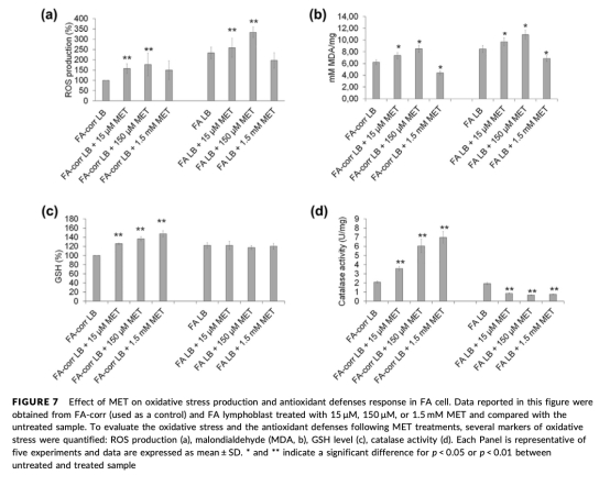 6 FA細(xì)胞特異性數(shù)據(jù):MET在FA細(xì)胞中雖增加線(xiàn)粒體質(zhì)量(圖6c),但氧消耗和ATP合成改善有限(圖6e、6f),且不增強(qiáng)抗氧化反應(yīng)(圖7)。研究意義在于揭示FA細(xì)胞線(xiàn)粒體缺陷(復(fù)合物I-III異常)削弱MET效益,強(qiáng)調(diào)疾病背景對(duì)藥物反應(yīng)的影響。