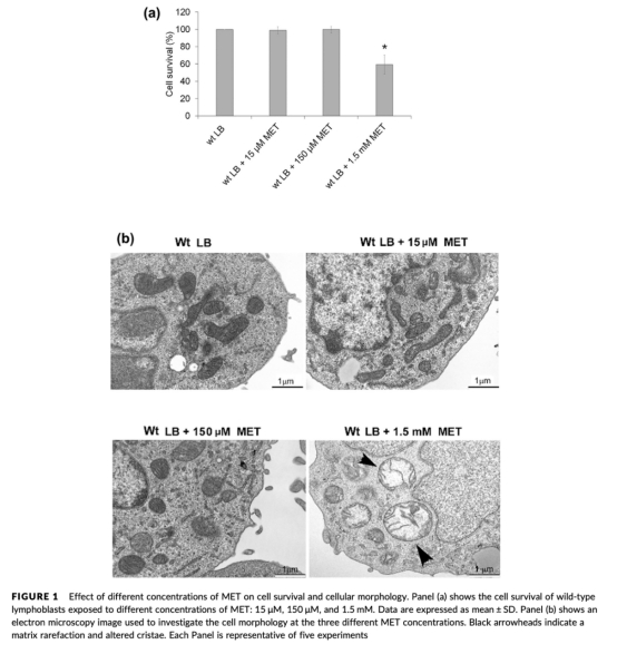 1 細(xì)胞存活和形態(tài)數(shù)據(jù):MET在1.5 mM時(shí)導(dǎo)致野生型細(xì)胞死亡約40%,并引起線(xiàn)粒體腫脹和結(jié)構(gòu)改變(圖1a、1b)。研究意義在于證實(shí)高濃度MET的細(xì)胞毒性,強(qiáng)調(diào)濃度選擇在體外實(shí)驗(yàn)中的臨界性,避免誤導(dǎo)性結(jié)論。