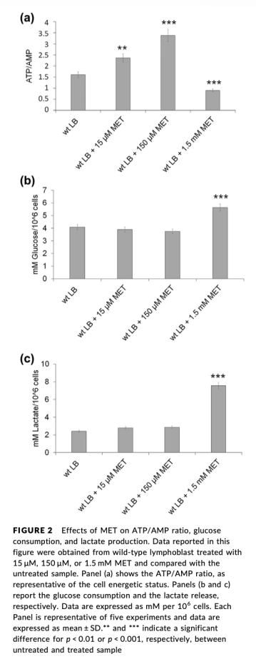 本研究旨在闡明二甲雙胍(MET)濃度依賴(lài)性效應(yīng)對(duì)細(xì)胞能量代謝、氧化應(yīng)激和生化反應(yīng)通路的影響,使用三個(gè)MET濃度(15μM、150μM和1.5 mM),分別對(duì)應(yīng)患者血漿濃度、中間濃度和抑制復(fù)合物I的濃度。同時(shí),評(píng)估MET對(duì)范可尼貧血(FA)細(xì)胞(一種存在能量和葡萄糖代謝缺陷的DNA修復(fù)遺傳病)和HL60白血病細(xì)胞的作用,以探討MET作為潛在治療候選物的可行性。