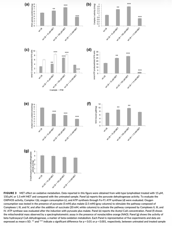 2 能量代謝數(shù)據(jù):低濃度MET增加ATP含量和ATP/AMP比(圖2a),增強(qiáng)PDH活性(圖3a)、復(fù)合物I活性(圖3b)、氧消耗(圖3c)和ATP合成(圖3d),但不影響葡萄糖消耗和乳酸產(chǎn)生(圖2b、2c);高濃度MET抑制有氧代謝,增加糖酵解(圖2b、2c)。研究意義在于揭示MET濃度依賴(lài)性雙向調(diào)節(jié)有氧代謝,低濃度促進(jìn)線(xiàn)粒體功能,高濃度誘導(dǎo)糖酵解轉(zhuǎn)換,為MET的代謝調(diào)節(jié)機(jī)制提供實(shí)證。