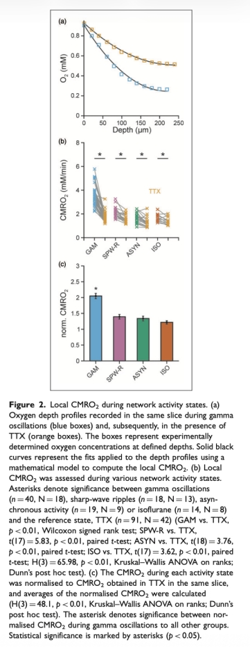 1 局部CMRO2數(shù)據(jù):測量了不同網(wǎng)絡(luò)活動狀態(tài)下的CMRO2值,顯示伽馬振蕩時最高(3.4 mM/min),尖銳波漣漪時中等(2.0 mM/min),異步活動和異氟烷時較低(1.7-1.6 mM/min),TTX時最低(1.4 mM/min)。這些數(shù)據(jù)來自圖2和表1。研究意義在于揭示了不同腦活動狀態(tài)的能量需求差異,伽馬振蕩作為高能量過程,可能與高級腦功能相關(guān)。