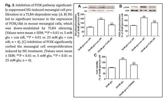 5. PI3K/Akt磷酸化數據:通過Western blot檢測PI3K和Akt的磷酸化水平,研究意義在于闡明TLR4下游信號通路的作用,表明PI3K/Akt通路在高葡萄糖誘導增殖中的關鍵性。數據來自Fig.3A和Fig.3B。