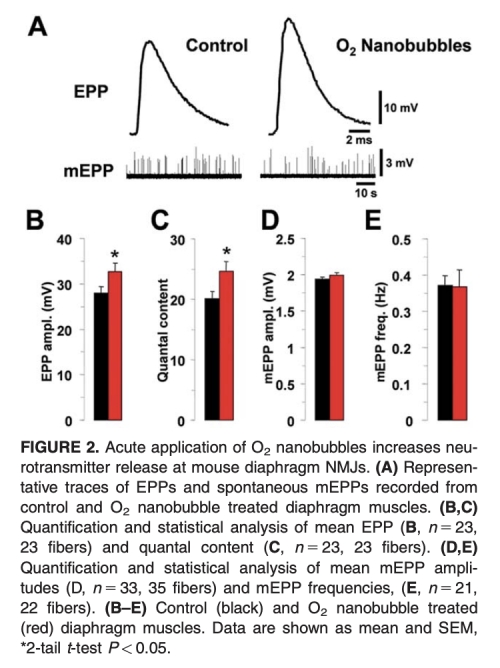 這篇論文研究了氧納米氣泡對小鼠膈肌神經肌肉接頭傳遞和肌肉功能的影響。摘要表明,氧納米氣泡提供了一種新的組織氧合方法。研究發現,在超級灌注氧納米氣泡溶液時,高頻神經刺激減緩了神經傳遞下降,增加了誘發的終板電位振幅和量化內容,但不影響自發性活動。電鏡顯示氧納米氣泡處理后的神經肌肉接頭積累了大的突觸小泡和內涵體樣結構。氧納米氣泡溶液對等長肌肉力無影響,但顯著降低了神經刺激肌肉的疲勞性和最大力恢復時間。結論是氧納米氣泡能增強神經傳遞并減少肌肉疲勞中神經傳遞失敗的概率。