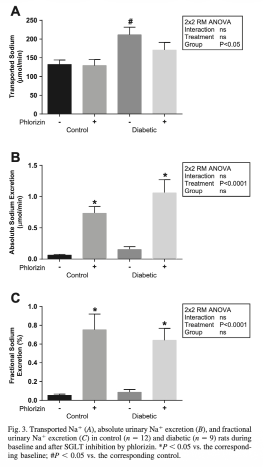5. 轉運的Na+(TNa,圖3A):SGLT抑制對總TNa無顯著影響,意義表明Na+轉運可能被重分布到其他腎單位節段,而非減少。