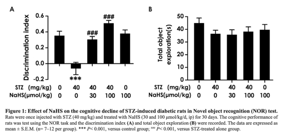 1. 新物體識別測試中的歧視指數(圖1A):STZ誘導的糖尿病大鼠歧視指數顯著降低,NaHS處理能劑量依賴性地提高歧視指數。研究意義在于表明H2S能改善識別記憶,這直接驗證了H2S對認知功能的保護作用。數據來自圖1A。