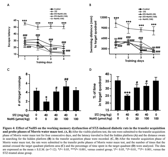 5. 轉移測試中的逃避潛伏期和游泳距離(圖4A和4B):糖尿病大鼠在轉移階段表現差,NaHS處理改善性能。研究意義在于表明H2S能促進工作記憶的適應性。數據來自圖4A和4B。