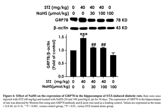 7. 海馬GRP78蛋白表達(圖6):糖尿病大鼠GRP78表達上調,NaHS處理下調其表達。研究意義在于表明H2S能抑制ER應激的初始信號,驗證了ER應激在糖尿病認知功能障礙中的角色。數據來自圖6。