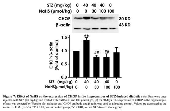8. 海馬CHOP蛋白表達(圖7):糖尿病大鼠CHOP表達增加,NaHS處理減少其表達。研究意義在于CHOP是ER應激相關凋亡標記,H2S的抑制效應提示其抗凋亡作用。數據來自圖7。
