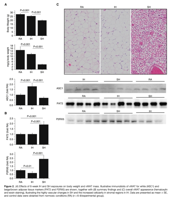 1 體重和vWAT重量:IH和SH暴露6周后小鼠體重和vWAT重量均減輕(SH > IH > RA)。研究意義在于確認缺氧導致代謝消耗增加,但不同缺氧模式對體脂分布影響不同。數據來自圖2A。