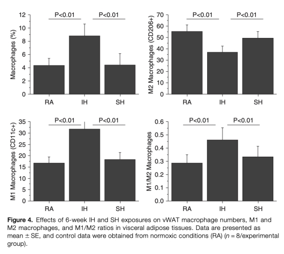 5 巨噬細胞浸潤:IH組vWAT中M1型促炎巨噬細胞增加,M2型減少,SH組無此變化。研究意義在于表明IH通過炎癥加劇胰島素抵抗。數據來自圖4。