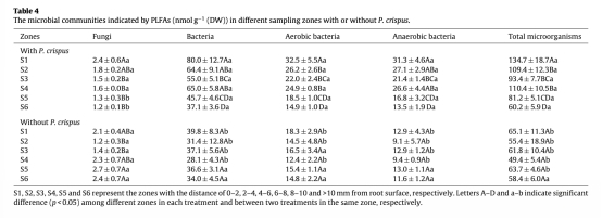 5 微生物群落結構(PLFA):數據來自Table 4和Fig.2,顯示種植處理好氧菌和厭氧菌生物量在S1-S5區(0-10mm)升高,好氧菌主導;聚類分析顯示根際微生物群落改變。研究意義是證實根分泌物和氧氣共同調控微生物群落,好氧菌對降解貢獻更大。