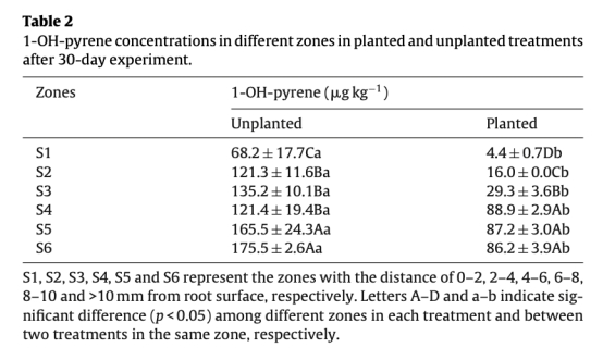 4 PAH降解菌數量:數據來自Table 3,顯示種植處理在S1-S4區(0-8mm)菌數更高(24.6-50.0%),S1區最高。研究意義是揭示微生物活性增強是芘降解的主要途徑,根際效應促進降解菌富集。