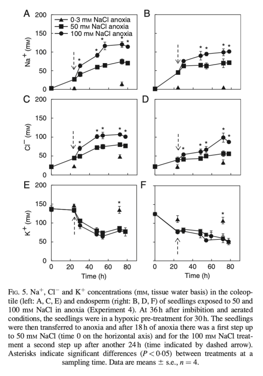 2. 組織離子濃度:測量Na+、K+、Cl-濃度(組織水基),顯示在缺氧條件下,Na+和Cl-濃度隨時間增加,K+濃度下降;外植胚芽鞘在50 mM NaCl下離子通量低于通氣條件。數據來自FIG.5、FIG.6和TABLE 3。研究意義是量化離子調節效率,表明缺氧條件下離子通量降低以節能,支持能量經濟型運輸的假設。