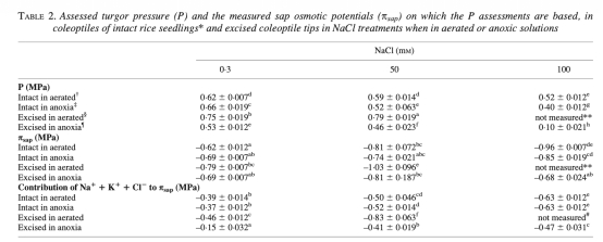 4. 組織滲透勢和膨壓:測量組織滲透勢和計算膨壓,顯示在NaCl脅迫下膨壓下降。數據來自TABLE 2。研究意義是反映滲透調節成本,膨壓降低可能為節能適應,但需維持細胞完整性。