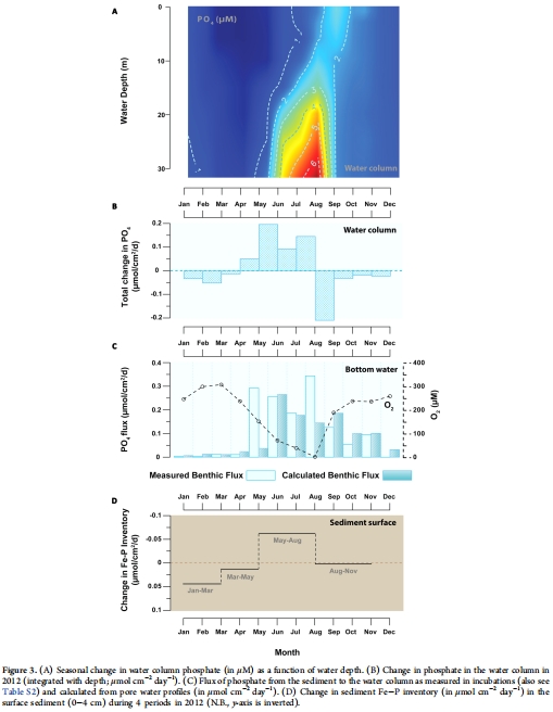 數據:顯示了2012年底層水從含氧(1-5月)到缺氧(6-7月)、再到無氧(8月)最后恢復含氧(9月后)的季節性變化,以及水柱磷酸鹽濃度的相應變化。