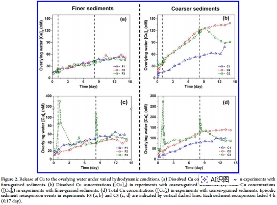 研究意義:這是最直接的證據。數據顯示,在粗顆粒沉積物(C系列)中,增加剪切力顯著提高了[Cu]d和釋放通量;而在細顆粒沉積物(F系列)中,不同水動力條件下的通量相似。再懸浮事件則導致[Cu]t急劇但短暫地升高。這說明水動力對金屬釋放的影響嚴重依賴于沉積物的異質性。