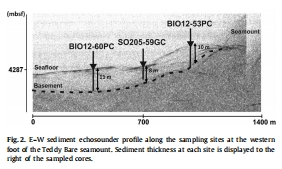數(shù)據(jù):所有位點的TOC含量都很低(<0.2%),且在距離海山最近的BIO12-53PC位點含量最低。