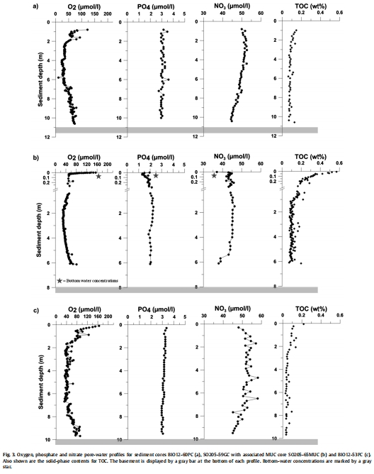 數(shù)據(jù):硝酸鹽剖面與氧氣剖面大致呈“鏡像”對稱:濃度在中部深度達到峰值,然后向基底方向降低。